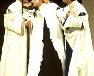 Paris. Théâtre du Châtelet. 6-XI-2001. Péter Eötvös : Tri Sestry. Gary Boyce, Alain Aubin, Bejun Mehta, Oleg Riabets, Peter Hall, Alexei Grigorev, Albert Schagidullin, Nikita Storojev, Wojtek Drabowicz, Gregor Dalal, Valery Serkin, Denis Sedov, Jan Alofs. Orchestre Philharmonique de Radio France. Direction : Kent Nagano et Péter Eötvös. Mise en scène, scénographie et lumières : Ushio Amagatsu. Décor et peinture : Natsuyuki Nakanishi. Costumes et maquillages : Sayoko Yamaguchi.