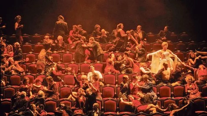 Pour les trois actes en flash-back, la mise en scène se transporte en effet d'abord sur un plateau d'Opéra, durant l'entracte de Don Giovanni, puis dans la fosse d'orchestre de ce même théâtre lyrique d'où l'on voit le proscenium et où se joue le tragique destin d'Antonia, enfin l'acte de Venise, planté sur l'avant-scène de la même salle, cette fois dos au public mais face aux fauteuils de velours rouge écarlate qui ondoient au rythme de la fameuse Barcarolle. Formidable plongée dans l'imaginaire théâtral que cette lecture virtuose des Contes d'Hoffmann qui passe en revue en moins de trois heures trois types d'opéras, bouffe, dramatique, fantastique.