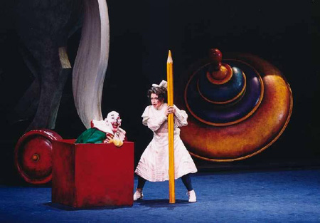 La mise en scène d'Andreas Homoki se situe au confluent de plusieurs univers, celui d'Alice au pays des merveilles ; et celui de la Comtesse de Ségur : les suivantes de l'Infante ressemblent à d'irritantes petites filles modèles. Comment ne pas songer également à l'un des films-phares du cinéma fantastique américain des années 30, Freaks ou La monstrueuse parade ? De surcroît, la créature, statufiée et vissée dans son socle est vêtue comme un clown pathétique, peinturluré de couleurs vives ; on l'exhibe tel un animal de foire (Elephant man, la Vénus hottentote…). Autre brillante trouvaille : les autres présents de l'Infante sont surdimensionnés : un livre de prières géant, un volumineux cheval de bois ; d'immenses crayons de couleurs comparables à des lances – un gigantesque ballon. D'emblée, tout cela contribue à amplifier la vulnérabilité du nain, en le plongeant dans un élément hostile où il ne saurait vivre. Ni même survivre.