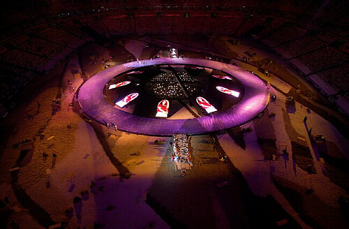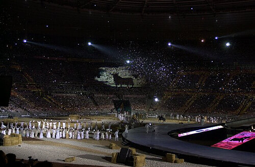 Saint-Denis. Stade de France. 20.IX.03. Georges Bizet (1838-1875), Carmen. Nora Gubisch, Luca Lombardo, Evgueniy Alexiev, Laurence Janot, Delphine Galou, Elisa Doughty, Grant Youngblood, Thierry Félix, Jérôme Corréas, Thomas Morris, Jean-Paul Muel. Orchestre Philharmonique de Radio France. Chœur de Radio France. Maîtrise de Radio France. Direction : Marco Guidarini. Chorégraphie Bruno Agati. Lumières : Jacques Rouveyrollis. Décors : Hélène Robert et Anne Carles. Mise en scène : Bernard Schmitt et André Serré