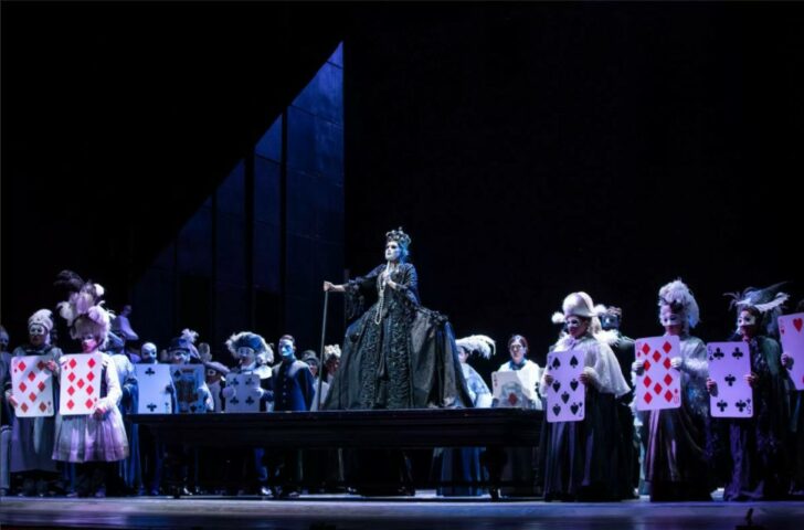 En dépit d'arie, d'ariosi, de monologues et de chœurs splendides, cette chronique psychanalytique déploie une ample mélodie continue. Véritable artiste de théâtre, focalise son attention sur le trio Hermann — Lisa — Comtesse ; trois créatures à la dérive, unies par un destin commun et une malédiction qui les désintègre graduellement. Presque une dimension nietzschéenne. A l'instar du brelan — l'as, le trois et le sept — ce conte cruel narre une « fin de parcours » de trois personnages en sursis. Drame de la folie, de la claustration, de la déchéance. Hermann entame dès le départ un calvaire initiatique, enfermé dans sa passion monomaniaque du jeu ; peu importent alors les moyens utilisés pour assouvir son vice. Lisa traîne un mal de vivre existentiel, aspirant à fuir un milieu corseté — celui de la vieille noblesse russe —, ainsi que le carcan d'un futur mariage convenu. Enfin, l'énigmatique Comtesse, surnommée la Dame de Pique (le symbole de l'adversité), est enfermée dans la nostalgie d'un passé révolu. Elle traverse les deux actes comme un pantin désarticulé, une momie, un zombie : voire un spectre pathétique à la quête d'un apaisement ou d'une délivrance.