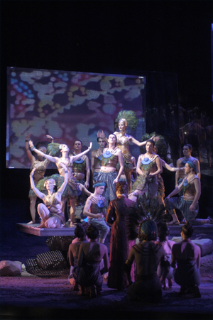 Dans la mise en scène de Stephan Grögler, le chevalier laisse du reste sa cotte de maille au vestiaire pour revêtir des costumes que l'on situera, à défaut de repères plus précis, dans les années cinquante. L'action paraît atemporelle dans le cadre imaginé par le maître d'œuvre natif de Berne. Un ponton horizontal, lieu de villégiature des attitudes procédant de la raison, surplombe une zone qui se veut désertique mais qui souffre d'un encombrement laissant perplexe. Du temps de Lully, les représentations de ses tragédies lyriques se vivaient dans la grandiloquence, à grands renforts de cabestans et de poulies qui hissaient et trimbalaient des décors sans cesse renouvelés, parfois dans un fracas qui couvrait les chanteurs, voire l'orchestre. Des draps peints suspendus offraient par ailleurs autant de points d'accrochage visuels permettant d'illustrer tout ou partie de l'action. Les costumes et accessoires étaient eux aussi au diapason de ces exigences scénographies qui confinaient peut-être à la mégalomanie.