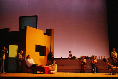Dans un décor sobre et clair offrant au regard plusieurs perspectives, Georges Lavaudant parvient à faire éclater l'espace pour diversifier les lieux de ce montage kaléidoscopique, laissant parfois l'attention du spectateur s'absorber dans la projection de scènes érotiques à la romaine sur un grand écran de télévision… Dans cette société un rien « déjantée » balançant entre l'humour et la gravité, le tragique et la dérision, il faut saluer les qualités tant vocales que scéniques des chanteurs/comédiens totalement investis dans leur rôle respectif. Familier de l'univers madernien, Luca Pfaff s'acquitte en virtuose d'une partition tout en clins d'œil qui déroute, provoque par sa fausse indigence, rejoignant l'esthétique du Pop-art que Maderna appelait de ses vœux.