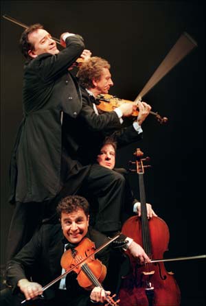 Le Quatuor, c’est quatre archets souverains inféodés à l’humour le plus malicieux, vingt cordes vibrantes mises au service virtuose des plus facétieuses révérences et irrévérences faites au monde parfois un peu sclérosé de la musique dite classique. Mais que l’on ne se trompe pas, l’exercice n’est pas un cri adolescent poussé au milieu de la jungle urbaine, ni une punkification outrancière et gratuite de la musique, loin s’en faut. « Quelle que soit la voie explorée, au-delà de toute parodie et de toute performance, la musique devra toujours en sortir vainqueur », nous rappelle Alain Sachs, le metteur en scène du spectacle. Cela fait maintenant douze ans qu’il pourvoit au succès du Quatuor, un ensemble qui donne désormais des spectacles loin à la ronde à raison de cent représentations par an.