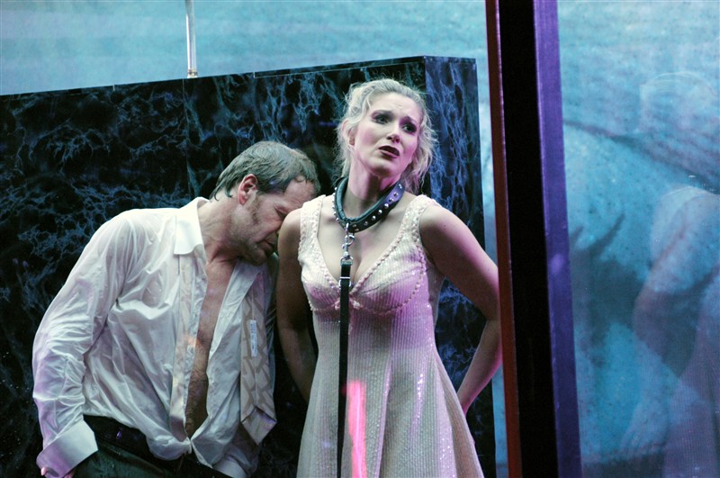 Au mieux une excellente publicité car pour la quatorzième et dernière représentation de cette saison de cette mise en scène du catalan Calixto Bieito, le Komische Oper qui joue plutôt devant des salles à demi pleines pour ne pas dire à demi vides (Lire l'article), regorgeait et on s'arrachait les dernières places sur Unter den Linden juste avant le lever du rideau. Rideau, si l'on ose écrire car en entrant le spectateur découvre la scène encombrée de bizarres vitrines tandis qu'une acrobate se livre dans les cintres à un exercice de trapèze.