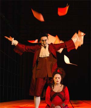 Dans le rôle-titre, Pierre Yves Pruvot fait montre de toute sa verve théâtrale et des magnifiques ressources d'une voix riche en harmoniques, au timbre mœlleux et agile dans les vocalises, dommage toutefois qu'il soit parfois un peu à court d'aigus. Pourquoi avoir choisi Jean Delescluses pour interpréter Almaviva? Ce très bon chanteur d'oratorio (il a tenu avec brio une partie de ténor lors des Vêpres mentionnées plus haut), avec sa voix blanche, son timbre sans séduction, ses aigus tendus et son manque d'italianita, n'a pas grand chose à gagner à interpréter les séducteurs méridionaux. Durant toute la soirée, on se demande si on n'est pas en train d'entendre un Basilio des Noces de Figaro plutôt qu'un Almaviva du Barbier. Philippe Georges est Bartolo, timbre fort agréable, diction mordante, mais manque de projection vraiment dommageable, au point qu'on a beaucoup de mal à l'entendre dès que l'orchestre joue un peu fort. Outre un Philippe Rabier impeccable en Basilio, la distribution masculine comprend également Patrick Alliotte-Roux et Jean Noël Poggiali qui se tirent très bien de leurs petits rôles. Face à eux, Hjördis Thébault, seule femme de la distribution, chante avec brio le rôle de Rosine. Le timbre est crémeux, les aigus insolents, elle se joue des difficultés de la partition, est à l'aise sur toute la tessiture (assez étendue d'ailleurs), une vraie prestation trois étoiles! Dans un décor assez nu, et à la symbolique un peu appuyée (une immense cage pour matérialiser l'enfermement de Rosine!), la direction d'acteurs d'Arnaud Décarsin est efficace mais n'évite pas un certain statisme, et la cage se révèle un peu étroite lorsque tous les protagonistes sont sur scène en même temps, ce qui donne une certaine impression de confusion.