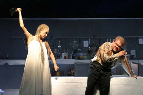 Le résultat, comme l'on a pu se rendre compte lors de cette reprise, est assez décevant. C'est que Madame Thalbach n'écoute pas la musique ! En transposant le chef d'œuvre de Richard Strauss à notre époque, en situant l'intrigue, avec un réalisme bien cru, dans la cuisine (sic !) du palais de quelque dictateur moyen-oriental, elle néglige complètement l'atmosphère morbide et l'esprit fin de siècle que dessinent cette partition. Surtout, Thalbach n'est nullement sensible à l'érotisme de la musique de Strauss ; cette Salome est sobre et froide. Lors de sa danse, l'héroïne n'ôte aucun vêtement. En revanche, elle déploie sept torchons de cuisine (les sept voiles ?) sur lesquels elle écrase des fruits et pétrit une pâte. Trois ou quatre fois, elle se caresse avec ces ustensiles. On ne sait vraiment pas ce qui excite tellement le roi Hérode!