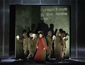 Mettre en scène une œuvre comme celle-ci présente des risques. Comment, en effet, ne pas apposer des regards redondants empêchant le spectateur de se forger une image en son for intérieur sur la base des suggestions et de la poétique des textes ? Comment relayer par un dispositif scénique ce que la musique dit de manière aussi forte ? Nicolas Brieger répond adroitement à ces questionnements suscités par l'œuvre elle-même. Le texte est projeté sur des parois dressées sur scène et marque les esprits par sa mise en place et divers effets y afférents. La langue de Rilke, traduite en français, glisse ainsi sur l'espace et le temps comme des formes possédant leur dynamique propre. Les tempi s'adaptent agréablement à l'égrainement des vocables qui entourent les visions souvent fugitives et intérieures de la mise en scène. La déclamation lyrique de Monica Groop s'accompagne de tableaux humains souvent forts et porteurs de sens pour la plupart. Si quelques partis pris demeurent difficiles à saisir (la putzfrau qui ripoline la paroi translucide qui la sépare du devant de la scène où chante, seule, l'alto finlandaise), les évocations de la mère, des armées, de la masculinité des soldats plaisent par leur pertinence et leur à propos. Le ballet des hommes nus pendus par un pied et la tête en bas est un moment fort de cette mise en scène. Nicolas Brieger évoque dans un ordonnancement quasi-chorégraphique l'entrelacs des pensées, souvenirs et rêves confus du cornette. Songes et réalité se mêlent. La vie intérieure, hantée par les cadavres, les tortures pratiquées par l'ennemi, est habitée par l'expérience amoureuse, érotique, que le jeune homme a vécue à la faveur d'un moment de repos, dans la tour, lorsqu'une inconnue l'entreprit. Innocence, mémoire et initiation ne font désormais plus qu'un dans l'esprit du soldat que le devoir et la mort finissent par appeler précipitamment. Tout au long des vingt-trois narrations, Monica Groop excelle par son sens travaillé du texte allemand, sa diction exemplaire et la magnifique texture de sa voix. De ses graves profonds et sans âpreté aux aiguës exigeantes des moments les plus tendus du récit, la mezzo-soprano est en phase complète avec l'œuvre, rendant au texte sa densité et à la musique son extraordinaire ambiance hâlée, colorée, crépusculaire. L'OSR, conduit par Patrick Davin, chef dont un des axes de travail prépondérants est le répertoire moderne, fait montre d'une grande circonspection. Il imprime une grande précision à sa lecture de la partition, dont il cultive l'éloquence avec conviction.