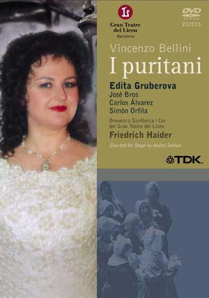 Ce n'est heureusement pas le cas de ce DVD enregistré il y a quatre ans à Barcelone qui, par ailleurs, la montre au sommet de ses moyens vocaux et interprétatifs. La voix est infiniment belle, la maîtrise technique est totale et la virtuosité est à couper le souffle. Et pourtant, toutes ses vocalises, ces messe di voci sublimes, ses suraigus impressionnants ne sont pas qu'une démonstration du savoir-faire de la prima donna. Au contraire, cette virtuosité est à tout moment au service de l'interprétation du personnage d'Elvira dont Edita Gruberová rend ainsi justice à toutes les facettes – en faisant oublier que, scéniquement, elle a déjà dépassé l'âge du rôle. Arturo est interprété par le ténor catalan José Bros. S'il ne possède pas les moyens exceptionnels du jeune Alfredo Kraus ou d'un Juan Diego Florez, il connaît les règles stylistiques du belcanto italien et il maîtrise avec une facilité admirable la tessiture presque inchantable du rôle, do dièse et ré suraigus inclus. Dans le rôle de Riccardo, Carlos Álvarez déploie toutes les richesses de son formidable baryton – malgré quelques aigus un rien poussifs –, s'avérant lui aussi un spécialiste du phrasé belcantiste. Plus en retrait, le Sir Giorgio de Simón Orfila, dont le timbre très clair manque de l'autorité pourtant indispensable à ce personnage.