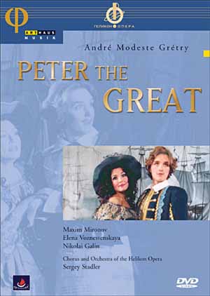 Le montage d’un opéra-comique français en Russie avait toutes les chances de conduire au naufrage, tout du moins pour des oreilles françaises. Il n’en est rien, et cette production, malgré un exotisme certain, se place d’emblée en tête de la très courte vidéographie : alors qu’il existe des dizaines de chefs-d’œuvre oubliés de Grétry, nous connaissions déjà Pierre le Grand par des représentations du Théâtre Impérial de Compiègne. L’écueil majeur du montage d’un opéra-comique, les textes parlés en français intercalés entre les airs, a été surmonté d’une façon originale : un des protagonistes dit le texte, voire déclame les didascalies, relayé par un autre qui raconte la même chose… en russe! La diction française n’étant pas la spécialité de la troupe, nous entendons pêle-mêle une étrange conversation dans une langue inconnue, dans lequel on reconnaît ça et là des morceaux de dialogues ou des descriptions de mise en scène dans notre langue maternelle. Tout cela pourrait être ridicule, c’est au contraire diablement séduisant et vivant, grâce à une mise en scène proche de la comedia del’arte, pas si loin des tréteaux de la foire, où chaque personnage mimique, grimace, anime son personnage ou l’interprète de façon décalée. Une véritable leçon de théâtre populaire, au sens noble du terme. L’esprit de Grétry est bien là, et bien là.