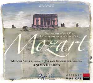 Wolfgang Amadeus Mozart (1756-1791), Concerto n°2 en ré majeur pour violon et orchestre KV 211, Symphonie n°29 en la majeur KV 201 concerto n°3 en sol majeur pour violon et orchestre KV 216. Midori Seiler, violon. Anima Eterna (Bruxelles), direction Jos van Immerseel. 1CD ZigZag territoires référence ZZT 051001. Enregistré du 23 au 25 février 2004 au Concertgebouw de Bruges. DDD. Notice de présentation quadrilingue (français, néerlandais, anglais et allemand)