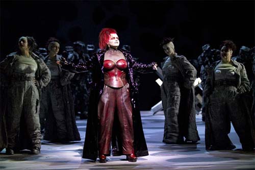 La nouvelle production (c'était la première ce 2 novembre) de La Forza del destino est plus originale mais guère plus convaincante. Plus originale par ses choix : les guerriers de l'acte 2 sont vêtus de treillis modernes alors que le début de l'acte 1 aurait pu se situer à l'époque précisée par le livret. Mais le monastère de l'acte 3 est un simple panneau vertical, tandis que la montagne où se réfugie Leonora est devenue trois poutres suspendues en l'air sur lesquelles la pauvre soprano est obligée de grimper pour chanter son grand air de manière inconfortable. Leonora est justement Andrea Gruber que nous avions entendue à la Bastille dans Turandot. La voix nous a paru moins puissante qu'à Paris et le vibrato plus prononcé. Mais l'engagement musical et scénique est irréprochable : sa Leonora vit, souffre, convainc.