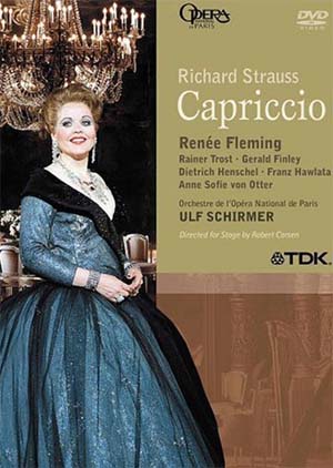 Robert Carsen fait de la scène du Palais Garnier une salle de vie où la tradition se meurt : lointain éloignement d'une société qui se perd, de l'ordre qui se trouble à la veille de la Seconde Guerre Mondiale, et désuétude de la noblesse viennoise. L'originalité du spectacle corroborait cette sensation en faisant asseoir Renée Fleming dans la salle de spectacle au côté des spectateurs pour l'audition du sextuor d'introduction, ou en faisant intervenir La Roche au bord de la fosse d'orchestre. L'intimité de la pièce en était certes modifiée, surtout que la taille de la scène du Palais Garnier et l'exploitation du Foyer de la Danse, à quelques soixante mètres de profondeur des feux de la rampe, accentuaient le champ d'action des personnages et le sentiment d'égarement de ceux-ci sur un plateau devenu trop large. Enfin, l'écartement des décors à la fin de spectacle confirmait la volonté de faire de ce spectacle un théâtre dans le théâtre, un régisseur apportant un café à Renée Fleming, une jeune demoiselle s'occupant de porter sa volumineuse robe, et le décor se levait pour faire face à la dureté de la pierre et à l'anonymat des coulisses. Une grande partie de ce charme est perdu dans la réalisation de ce DVD, où Renée Fleming, Rainer Trost, Gerald Finley, sont filmés en tant que spectateurs dans les loges de l'Impératrice et de l'Empereur, les véritables spectateurs ont été simplement supprimés, mais leurs applaudissements sont audibles, et le plus regrettable réside dans les mauvais raccords sonores entre les différentes scènes, on entend le passage entre les moments pris sur le vif, et les autres, travaillés pour les besoins du DVD. Mais ne boudons pas notre plaisir ; il y a là une très belle Comtesse, qui chante merveilleusement bien. Renée Fleming a une belle voix, elle le sait pertinemment et elle s'écoute beaucoup dans les moments les plus lyriques, rend justice au son, moins à ce qu'elle dit, l'articulation est des plus exotiques, contrastant singulièrement avec celles de ses confrères. De plus, certaines poses la rendent presque vulgaire, avec des déhanchés et un certain exhibitionnisme dans la démarche qui se veut distinguée, mais ne l'est pas vraiment. Face à elle, de solides « muses », Rainer Trost et Gerald Finley, sans être véritablement attachants, sont tout de même convaincants dans leur rôle respectif. Anne Sofie von Otter fait de Clairon une actrice caricaturale, un brin Broadway, avec quelques notes graves escamotées, mais la voix est encore vaillante pour ce genre d'emploi. Un des sommets de cette distribution est Franz Hawlata qui, prononciation exemplaire et implication de l'artiste aidant, donne une rude leçon à ceux qui se déclarent artistes mais qui n'ont jamais réfléchi à ce qu'est vraiment l'Art ; son monologue est d'une vérité dramatique poignante, legs d'un homme qui a voué sa vie au mieux être des spectateurs, ce que nous supposons être le cas de tous les directeurs de théâtre.
