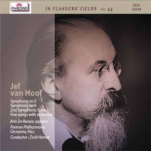 La courageuse conviction de Phaedra nous vaudra, espérons-le, une intégrale en CD des symphonies de Jef van Hoof : un premier CD (92013) nous a déjà offert de magnifiques versions des Symphonies n°1 en la et n°4 en si, avec en complément l'Ouverture « Guillaume le Taciturne », sous la direction intelligente, chaleureuse et sensible de Fernand Terby (1928-2004), interprétations parvenant à rivaliser avec celles de Sternefeld, en une prise de son stéréophonique sensiblement supérieure. La toute récente production Phaedra (92044) sous rubrique nous permet d'apprécier les Symphonies n°5 en mi et n°6 en si bémol « Inachevée » – le Finale ne consistant qu'en une fanfare de quelques secondes : également rédigées comme leurs aînées dans le moule des quatre mouvements traditionnels, elles s'en distinguent par un lyrisme épuré et une structure plus concise, tout en conservant, dans les parties rapides, l'homorythmie si typique du compositeur, évoquant immanquablement quelque danse villageoise flamande. Toutes ces caractéristiques de rythme et de couleur, on les retrouve à suffisance dans la Seconde suite symphonique de 1952, où l'aspect pictural de la musique est plus évident, où les alternances de tendresse et d'humour sont plus marquées. Quant aux Cinq mélodies avec orchestre sélectionnées dans l'abondante production vocale de Jef van Hoof et proposées ici, elles offrent un aspect particulièrement élégiaque du compositeur, évoquant Duparc à s'y méprendre, musique aux raffinements et subtilités fauréennes inépuisables que la soprano Ann De Renais met admirablement en valeur.