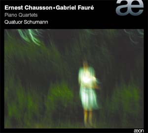 Ernest Chausson (1855-1899) : Quatuor avec piano en la majeur op. 30 ; Gabriel Fauré (1845-1924) : Quatuor avec piano n° 1 en ut mineur op. 15. Quatuor Schumann : Tedi Papavrami, violon ; Christoph Schiller, alto ; François Guye, violoncelle ; Christian Favre, piano. 1 CD Aeon (distribution Harmonia Mundi). Ref. : AECD 6540. Enregistré en juin 2005 à L’heure bleue, La Chaux-de-Fonds, Suisse. Notice bilingue (anglais / français). 1h09mn36s