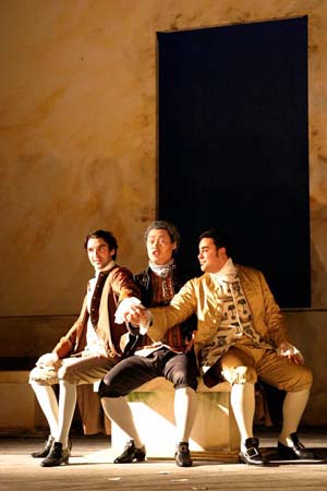 Besançon. Opéra Théâtre. 27-I-06. Wolfgang Amadeus Mozart (1756-1791) : Così fan tutte, opéra en deux actes sur un livret de Lorenzo da Ponte. Mise en scène : Didier Brunel et Guillaume Dujardin ; scénographie : Didier Brunel ; costumes : Florence von Gerkan ; lumières : Jürgen Hoffmann. Avec : Karen Vourc’h, Fiordiligi ; Gemma Coma-Alabert, Dorabella ; Khatouna Gadelia, Despina ; Philippe Rabier, Guglielmo ; Philippe Talbot, Ferrando ; Kyung Il Ko, Don Alfonso. Chœur de l’Opéra Théâtre et Chœur Contre-Z’Ut (direction : Alain Lyet), Première Académie Mozart Européenne de Besançon, direction : Nicholas Jenkins.