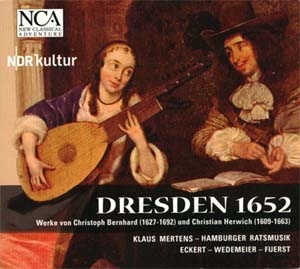 nca_dresden-300x269Le label allemand NCA nous fait découvrir avec « Dresden 1652 » deux compositeurs tout à fait méconnus qui datent des origines de l'ère baroque germanique, notamment contemporains de Heinrich Schütz : (1627-1692) et Christian Herwich (1609-1663), deux musiciens assez différents qui se sont rencontrés au moins une fois de leur vivant, à Dresde en 1652, d'où le titre donné à ce disque.
