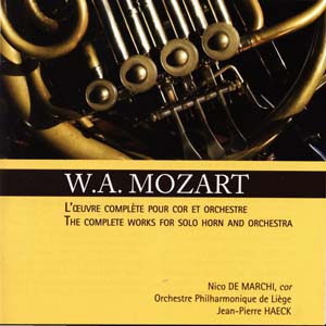 Comme tous les pianistes souhaitent graver les sonates de Beethoven, tous les cornistes émérites se sont penchés sur l'enregistrement de ces partitions et on ne dénombre pas moins d'une cinquantaine de versions disponible régulièrement au catalogue. Deux artistes surclassent aisément les débats : Dennis Brain (disque EMI sous la direction de Karajan) et Barry Tuckwell (auteur de quatre intégrales de ces concertos). En l'absence de véritables stars de l'instrument, les premiers solistes des orchestres ont eux aussi tenté la confrontation avec ces partitions, et c'est d'ailleurs ce type d'essai qui compose la majorité des témoignages dans ces œuvres. La présente intégrale nous propose la vision de Nico de Marchi, le cor solo de la Philharmonie de Liège sous la direction de Jean-Pierre Haeck, son premier chef invité. Techniquement, la virtuosité du corniste est digne d'éloges, et le soliste se joue des difficultés techniques de ces partitions sans jamais forcer les notes. Le son est certes splendide, mais il manque un poil de personnalité sonore à ce musicien pour marquer notre esprit, d'autant plus qu'on en reste souvent à une approche un peu trop scolaire des partitions, les mouvements rapides étant assez avares en humour et les romances manquant d'abandon. L'accompagnement de l'orchestre est très professionnel, Jean-Pierre Haeck évite de tomber dans la romantisation à excès, éternel piège de ces œuvres. Les tempi sont rapides et le chef est attentif à son soliste. Cependant, l'orchestre si brillant dans d'autres répertoires, ne s'affirme pas, du moins au disque, comme la phalange rêvée pour cette musique. Les timbres sont encore assez français : cordes saillantes et vents un peu verdâtres. En complément des concertos, Nico de Marchi offre judicieusement les brefs Rondo en mi bémol K 371 et le Mouvement de concert en mi K 494a dont la prise de son est perturbée par d'incroyables bruits dans le studio.