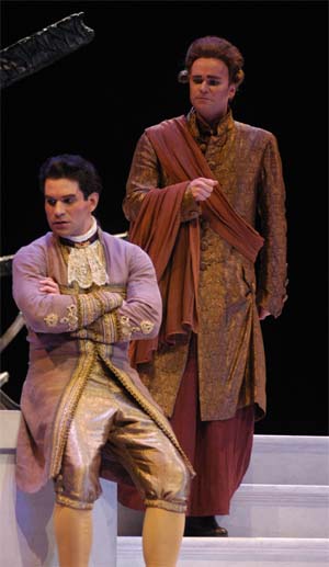 La mise en scène de Chas Rader-Shieber, est d'un immobilisme à refroidir tous les bouges de Rome. L'interaction des personnages est souvent absente voire nulle. Pensons à la première scène, entre Sextus et Vitellia, leur duo «come ti piace» auquel semble répondre en écho cet autre duo entre Servilia et Annius «Ah, perdona al primo affetto» où celui-ci croit avoir perdu sa maîtresse à jamais. Art figé, distancié alors que ces scènes requerraient plus de chaleur. Éloignement voulu entre les personnages et on se demande si l'opéra ne gagnerait pas à être représenté en version de concert. On comprend que l'œuvre soit difficile à monter et que l'entreprise scénographique soit périlleuse. Nulle part, le metteur en scène n'a tenté d'insuffler vie aux personnages et de leur donner un certain mordant. Le chœur souvent statique, drapé du péplum romain, semble perdu entre ciel et terre, éthéré en quelque sorte. La mise en scène omet ainsi la complexité des rôles de Titus, les remords de Sextus et les aveux de Vitellia. Mais il revient aux chanteurs de caractériser leur personnage. Nous y reviendrons. Les décors de David Zinn renvoient le spectateur au plus bas dénominateur commun avec ses deux murs latéraux et à l'arrière-scène, une porte coulissante qui s'ouvre et se referme. Les quelques changements à vue se font comme par enchantement. Mais les décors présentés sont souvent dignes d'un musée d'inepties. Pour suggérer l'incendie du Capitole, on se sent plutôt transporté dans une salle de démonstration de foyers à combustion lente. La scène précédente alignait les bustes des empereurs romains dont l'effet est grotesque et sans goût. Après le coup d'état raté, le désordre est symbolisé par un amas d'éléments disparates et des chaises renversées. Enfin, la dernière scène, mieux inspirée celle-là, enchâsse l'empereur dans les Champs-Élysées, pieds nus, foulant les hautes herbes. Figure emblématique, il demeure un modèle inégalé, inaccessible, au-dessus de la triste condition humaine. Heureusement, l'éclairage de Lenore Doxsee parvient à suggérer une atmosphère troublante et plus significative. Par contre, le fait de propulser l'action au siècle des Lumières ne rajoute strictement rien. D'ailleurs, on joue sur les deux tableaux du temps, certains personnages, Publius, l'empereur et le chœur sont drapés à l'antique, tous les autres portent le costume dix-huitième. Ainsi, les protagonistes passent d'un acte à l'autre du noir au blanc, de l'obscurité à la lumière, du mensonge à la vérité.