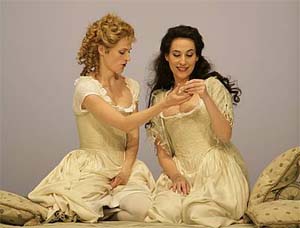 Fiordiligi et Dorabella (Maria Rey-Joly et Sophie Marilley respectivement) possèdent toutes deux des voix fort à propos pour Mozart. Capables de vocaliser avec aisance et précision, les deux cantatrices, chacune dans sa tessiture, font montre d'une projection généreuse, dotant leur chant d'inflexions qui entretiennent un rapport au texte très plaisant, notamment dans les récitatifs. Maria Rey-Joly s'est piquée d'un Per Pietà agile et d'une grande pudeur, loin des accès furibonds qui y ont parfois cours. L'imploration a pris avantageusement le pas sur la seule démonstration pyrotechnique. Fin chanteur au timbre séduisant, le baryton Mario Cassi (Guglielmo) s'est parfois laissé couvrir dans les grands ensembles. Quant au ténor Antonis Koroneos, il se profile également comme un chanteur idoine pour Mozart, un brin court peut-être. Il a gratifié la soirée d'un superbe « Un'aura amorosa » y osant les nuances des plus raffinées mais lors du deuxième acte, le même chanteur a montré des signes de fatigue. Don Alfonso et Despina, le troisième couple en quelque sorte, a bénéficié d'atours indéniables, avec des interprétations directes et vivantes. Ce panorama critique ne serait pas complet sans souligner l'excellence de la prestation de l'Orchestre de Chambre placé sous la direction souple et équilibrée de Jean-Yves Ossonce.