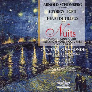 Arnold Schoenberg (1874-1951) : !a Nuit Transfigurée op. 4 pour sextuor à cordes ; György Ligeti (né en 1923) : Quatuor à cordes n° 1 » Métamorphoses Nocturnes » ; Henri Dutilleux (né en 1916) : Ainsi la Nuit pour quatuor à cordes. Quatuor Rosamonde : Agnès Sulem-Bialobroda, 1er violon ; Thomas Tercieux, 2nd violon ; Jean Sulem, alto ; Xavier Gagnepain, violoncelle ; Antoine Tamestit, 2nd alto ; Jérôme Pernoo, 2nd violoncelle. 1 CD Pierre Verany (Arion distribution) PV 706021. Enregistré à l’Auditorium Antonin Artaud, Ivry-sur-seine, 17-29 septembre 2005. DDD. Notice : français, anglais. Durée : 67’53