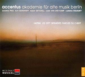 La version pour orchestre et voix, interprétée ici, est quant à elle de facture plus concertante. Composée plus tardivement, en 1796, cette version n'est pas une idée de Haydn lui-même. Mais après avoir entendu avec plaisir l'initiative de Friebert à Passau, il reprend l'idée à son compte persuadé de « faire mieux ». Haydn ne se limite pas à placer des voix sur l'orchestre. Il remanie quelque peu la partition originale, en modifie l'instrumentation et introduit de nouvelles parties. L'interprétation de Laurence Equilbey met, du reste très en valeur ces ajouts du compositeur. Les « entêtes » épigraphiques a cappella qui introduisent désormais presque toutes les paroles du Christ, sont l'occasion offerte à Accentus de donner le meilleur de lui-même. Elles sont, du reste, les parties les plus expressives du drame qui se joue et que l'ensemble instrumental peine parfois à rendre, sans doute à cause du tempo légèrement trop rapide. Mais un tempo plus lent ne nous aurait-il pas entraîné dans une interprétation romantique, de fait anachronique ? C'est, peut-être, la difficulté de l'œuvre. Son équilibre, d'une facture incontestablement classique, semble parfois tendre vers le romantisme, particulièrement dans le « Tout est accompli ! » dont certains passages ne sont pas sans rappeler la Symphonie n°9 de Beethoven. Il est alors d'autant plus dommage de retrouver dans la version de Laurence Equilbey des tendances baroques peu appropriées. En revanche, la clef de lecture de son interprétation qu'elle expose elle-même dans la notice, semble être la clef de la réussite. « Pour une fois, dans les Sept Paroles, […] : ce sont les voix qui ont été destinées à « coller » aux instruments, puisque la version orchestrale est antérieure à celle proposée dans cet enregistrement.