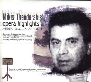 Míkis Theodorákis (né en 1925) : Medea ; Electra ; Antigone (extraits). Emilia Titarenko, Médée/Chrysosthemis/Antigone ; Nikolaï Ostrovski, Jason ; Daria Rybakova, Coryphée ; Galina Dolbonos, Electre ; Peter Migunov, le Pédagogue/Etéocle ; Irina Liogkaïa, Jocaste ; Evgeni Vitchnevski, Polynice. Chœur et Orchestre de la Capella de Saint-Pétersbourg, direction : Mikis Theodorakis. 1 CD FM Records FM 1710. Enregistré en avril 1998 (Electra) et octobre 1999 (Medea, Antigone) à Saint-Pétersbourg. Notice et livrets bilingues (grec – anglais). TT : 68’25’’