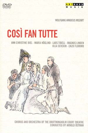 Avec cette production du Festival de Drottningholm mais surtout avec son enregistrement plus connu de l’intégrale de Così fan tutte au disque (chez L’Oiseau Lyre, 1984), Östman travaillait à reconstituer ce que pouvait être l’opéra lors de sa création, avec un petit orchestre et des tempi extrêmement lestes, parfois au détriment du propos du livret. On cherchera par exemple en vain la rêverie amoureuse des deux sœurs dans un « Ah, guarda sorella » des plus rapides. Ann Christine Biel, dont ce Così marque les débuts scéniques, interprète le rôle de Fiordiligi avec beaucoup de rigueur. Son chant assez dépouillé fait penser à Elisabeth Schwarzkopf dans le même rôle. Maria Höglind est une Dorabella au timbre mœlleux à souhait, d’un « Smanie implacabili » plein de jeunesse au « E amore un ladroncello » capiteux, invitation au plaisir. Cette édition ne deviendra peut-être pas un DVD de référence parce qu’elle retranche une quarantaine de minutes au troisième opéra du duo de génie Mozart/Da Ponte dont l’air de Guglielmo : « donne mie, la fate a tanti », des morceaux de récitatifs, etc. et que la distribution est très inégale. Elle n’en demeure pas moins agréable et visuellement très plaisante. Bien qu’Östman n’ait pas fait l’unanimité avec son interprétation, sa version recèle de beaux morceaux comme le duo Guglielmo/Dorabella « Il core vi dono » de l’acte II.