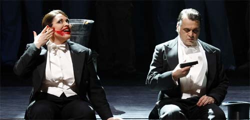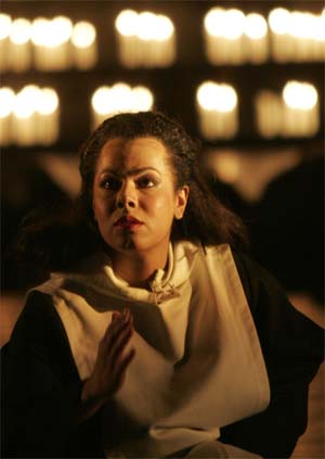 En pays germaniques, nous avons pris l'habitude depuis bien des années de nous voir proposer ce que l'on appelle des relectures des grandes œuvres du répertoire lyrique. Certaines sont plus cohérentes, d'autres le sont moins. La nouvelle production de la Force du destin signée Christian Schuller que l'Opéra de Cologne présente ces jours-ci, n'est même pas une relecture. Il s'agit plutôt d'un mélange assez indigeste de non-sens et de contresens, sans oublier les moments ridicules ou franchement incompréhensibles. Ainsi au premier acte, nous trouvons Leonora en habit de voyage et chargée de valises dans une sorte de gare. Dommage seulement que le livret demande à son père de lui souhaiter la bonne nuit. Au deuxième acte, Leonora arrive devant le couvent ( ? ?) entourée d'une vingtaine de femmes. Fra Melitone, très gentil, les fait entrer une par une pour ensuite répondre à Leonora que l'église n'ouvrira ses portes qu'à cinq heures du matin. Quelques instants plus tard, Preziosilla est témoin du grand duo entre le père Guardiano (vêtu comme un évêque) et Leonora, avant que Melitone n'aide celle-ci à changer sa robe en habit de moine. Tant pis si Guardiano lui promet que lui seul connaîtra son identité ! Dans cette logique il n'est plus que conséquent que pour son air de la paix, Leonora soit entourée d'un groupe de pèlerins. A tout cela s'ajoutent des décors soit absents soit laids, des costumes sans charme et une direction d'acteurs qui brille par son absence. Voilà ce que nos confrères américains aiment appeler du «euro trash» ! !
