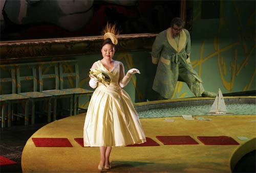 Au pupitre de l'excellent Gürzenich-Orchester, le très jeune chef Enrico Delamboye nous livre une lecture marquée par l'élan et la verve, ne gommant pas pour autant les moments de poésie ou de pure émotion. Dans le rôle-titre, Maurizio Muraro ne campe pas le vieux barbon habituel, mais dresse le portrait profondément humain d'un célibataire têtu, aux habitudes quelque peu étranges. Vocalement, il s'avère digne des plus grands interprètes du rôle avec une voix de basse à la fois pleine et souple, homogène du fa grave au fa aigu, et avec un sens remarquable des nuances et des couleurs. En docteur Malatesta, nous admirons encore le grand talent de Miljenko Turk. Le jeune baryton séduit par la beauté de son timbre, un registre aigu particulièrement lumineux, un phrasé élégant et une maîtrise admirable du canto sillabato. La troisième merveille, c'est la Norina d'Insun Min. La jeune artiste n'a pas seulement le tempérament et le physique du rôle, mais elle possède également la vocalité requise pour l'emploi : Une voix de soprano légère mais consistante, sans un brin d'acidité dans l'aigu, à l'aise dans les moments de virtuosité, mais aussi dans les élans lyriques. En ce qui concerne le ténor Mario Zeffiri, il faut d'abord saluer son courage et son professionnalisme : Appelé de Rome le matin même pour remplacer à 16 heures son collègue souffrant Musa Nkuna, il a su s'intégrer à la mise en scène sans aucune difficulté. Stylistiquement, son chant nuancé n'appelle aucune reproche ; quant à la qualité du timbre, assez perçant notamment dans les nombreux aigus ajoutés, on est un peu plus réservé.