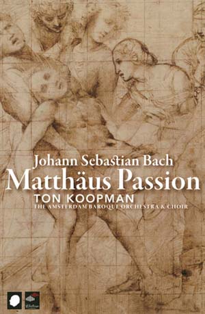 Des cinq Passions que Bach aurait écrites, seules deux ont survécu dans leur intégralité. On ne peut que regretter ces pertes tant sont géniales la Passion selon St Jean et la Passion selon St Matthieu. Cette dernière, composée par Bach en 1727 pour double chœur, solistes et orchestre, est la plus longue, la plus aboutie, la plus riche ; elle surpasse tout ce que Bach ou tout autre compositeur a écrit auparavant de par ses dimensions internes et externes. On regrette donc simplement que Ton Koopman ne se soit pas lui aussi surpassé dans cette nouvelle lecture de l'œuvre…