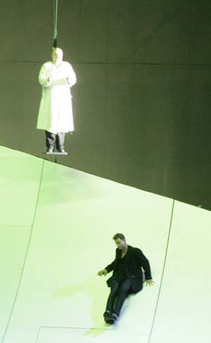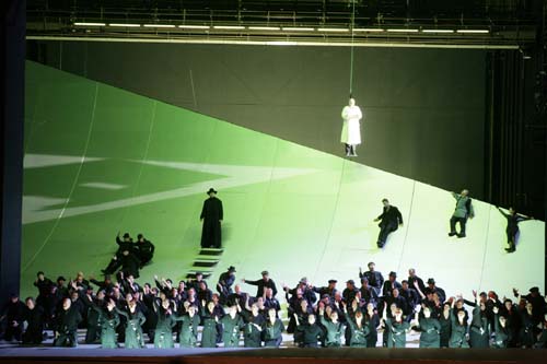 Comment mettre en scène ce drame biblique, écrit sous l'impression du nazisme qui, pourtant, n'a nullement perdu son actualité ? Dans un cadre très abstrait, dominé par des structures métalliques, David Pountney nous offre une mise en scène basée sur des associations et des symboles. Après un premier acte plutôt sobre, la grande scène du veau d'or s'avère un immense capharnaüm d'images plus ou moins faciles à déchiffrer. Le veau d'or de Pountney, ce sont les idoles du monde d'aujourd'hui : la voiture et la moto, la gourmandise et le sexe. Et dans tout cela, la violence est omniprésente. L'idée est certes pertinente, certaines scènes sont même fascinantes, mais la profusion d'image finit par lasser. En outre, la fin nous intrigue : Moïse tue Aron. Mais comment cet homme, qui vient de recevoir de Dieu même les Dix Commandements, peut-il tuer son propre frère ?