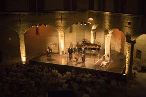 Ce concert est le premier d'une longue série enregistrée par France Musique – diffusion prévue en septembre ou octobre. Mais concert est-il réellement le terme exact ? Il s'agissait plus exactement d'une soirée dédiée à la musique et au monde musical entourant Robert Schumann : Tout au long de la soirée, moments musicaux et littéraires s'alternent. La formule est originale et envoûtante. Deux acteurs – et pas des moindres : Lambert Wilson et Emmanuelle Cordoliani – se donnent la réplique à travers des extraits de la correspondance de Clara Schumann et Johannes Brahms, ou des écrits de Clara, Robert et Marie (leur fille) Schumann. Peu à peu renaît ainsi tout un univers qui débute lors de l'arrivée de Brahms dans la famille et s'interrompt en 1859, trois ans après la mort de Robert. Les crises de folie, l'internement, l'amitié extrême et parfois ambiguë, le regard – parfois très critique – sur leurs contemporains sont ainsi explorés avec leurs propres mots. Peu à peu les spectateurs ne savent plus vraiment où ils sont, ni à quelle époque. Le mistral et la nuit étoilée ajoutent à cette sensation magique de voyager dans un autre univers que l'on pensait connaître mais que l'on ne faisait que soupçonner. Et lorsque la musique apparaît, c'est dans une totale complémentarité. Est-ce la musique qui illustre les textes ou les textes qui mettent en valeur la musique ? Toujours est-il que ces interprétations si fines et complices semblent l'être encore plus dans ce contexte. D'autant que le plein air d'été sied particulièrement au répertoire romantique de la musique de chambre, au risque de tomber dans une image d'Epinal.