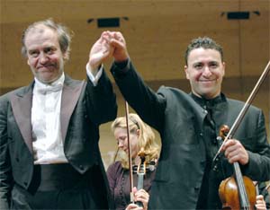 Le concert du lendemain vécu depuis des places mieux centrées a confirmé le réel malaise du jour précédent. Certes la sonorisation reste encore perceptible, surtout pour l'auditeur dont l'attention est aiguisée par son expérience de la veille. Les sons arrivent-ils de l'orchestre ou des haut-parleurs ? Si les bois semblent toujours prédominants, l'écoute est autrement plus acceptable que lors du précédent concert. L'orchestre, le merveilleux London Symphony Orchestra affirme sa présence avec ses superbes violons, et ses autres magnifiques pupitres. Dès les premières mesures du Concerto pour violon et orchestre de Dmitri Chostakovitch, l'émotion est palpable. Très inspiré, porté par la musique et l'admirable direction d'orchestre de Valéry Gergiev, Maxim Vengerov, en très grande forme cette fois, offre un violon de rêve. Sensible à l'extrême, le Russe régale l'audience d'une interprétation parsemée de pianissimi transparents issus d'un autre monde. Exposant à merveille l'intimité du premier mouvement, la rudesse du second et le pathos presque « beethovénien » du troisième, c'est au terme d'un quatrième mouvement endiablé, fruit d'une parfaite symbiose entre le chef, l'orchestre et le soliste que le climat s'enflamme. Attentifs aux autres musiciens, aux plus infimes modulations, comme aux plus grands déferlements sonores, tant l'orchestre que le soliste s'est fondu dans l'émotion de cette musique à l'intensité passionnelle exceptionnelle. Le public ne s'y est pas trompé, réservant sans réserve l'explosion de ses acclamations à cette nouvelle pierre blanche à porter au crédit de l'histoire du Festival Menuhin.