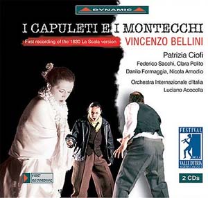 Vincenzo Bellini (1801-1835) : I Capuleti e i Montecchi. Patrizia Ciofi, Giulietta ; Clara Polito, Romeo ; Danilo Formaggia, Tebaldo ; Federico Sacchi, Capellio ; Nicola Amodio, Lorenzo. Coro Slovacco di Bratislava (chef de chœur : Pavol Procházka) ; Orchestra Internazionale d’Italia, direction : Luciano Acocella. 2 CD Dynamic CDS 504/1-2. Enregistré sur le vif en août 2005 au Festival della Valle D’Itria à Martina Franca. DDD. Notice en italien, allemand, français et anglais. Durée : 2h09mn.