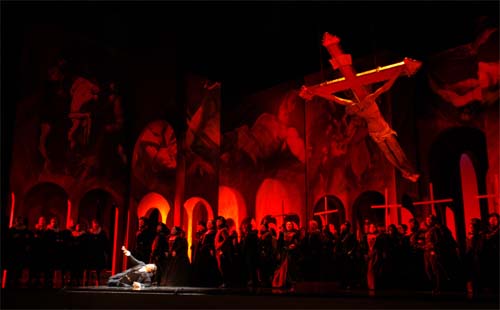 Au pupitre d'un orchestre surexcité qui lui obéit au doigt et à l'œil, James Conlon, absorbé, vautré dans cet immense chef-d'œuvre, capture l'essence pleine de ce Don Carlo avec punch et poésie. Un somptueux plateau, fortement homogène et convaincant (parce que convaincu), une imposante production (traditionnelle mais suffisamment solide) dament le pion à la Traviata de la veille au soir.. C'est ce Don Carlo, superbement abouti, qu'il fallait filmer !…