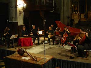 Chacun des grands morceaux du concert furent entourés de préludes, mélodies et improvisations pour passer d'une modalité à une autre et d'une ambiance à l'autre. La première partie du concert était plus dédiée à la musique orientale avec en point de mire l'Oratorio della Santa Purificazione qui, comme Fritch le dit à son public, essuya un refus pour être interprété en public car harmoniquement trop audacieux. Il est vrai que ce dialogue en musique à cinq voix avec cinq tonalités différentes (dorien, phrygien, éolien, lydien et hypolydien) avec entre autres des intonations en ré bémol majeur était hors limites de la musique occidentale. Superbe ! S'en suivit des improvisations et mélodies dans le mode Esfahan où curieusement le traverso en fermant les yeux devenait neÿ iranien. Les modulations géniales de rythme du zarb emmenèrent les spectateurs jusqu'à une chevauchée épique en Arménie et en Iran.