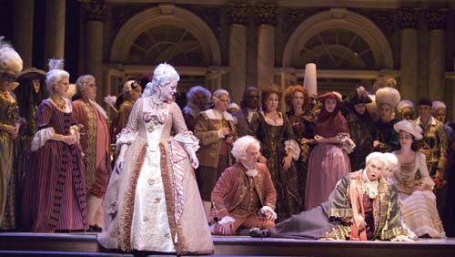 Légèrement modifiés, mais si peu, les décors et les costumes, vus ici même en 82, 85, 90 et 99, ont pris poussière et, mornes et mats, surprennent, miséreux. La mise en scène, qui devrait, elle, regorger de surprises, d'atmosphères, inexistante (inutile donc d'accumuler les adjectifs !) déroute (on pourrait mentionner son statisme, son opacité).