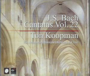 Johann Sebastian Bach (1685-1750) : Intégrale des Cantates, Vol. 22. The Amsterdam Baroque Orchestra & Choir, direction Ton Koopman. 3 CD Challenge Classics. Ref. : CC72222. Enregistré dans l’église Waalse Kerk à Amsterdam entre mai 2002 et novembre 2005. DDD. Textes allemand et latin traduits en anglais et en français et notice trilingue (allemand-anglais-français). Durée : 200’.