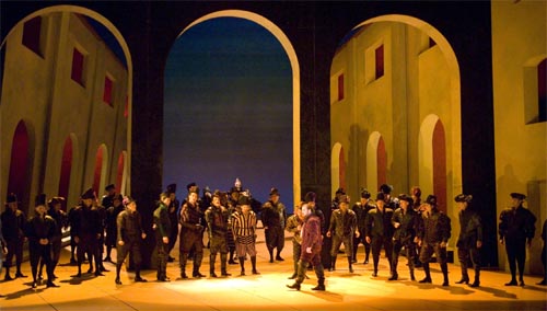 Reprise assurément alimentaire (puisqu'elle remplira la War Memorial Opera House… nous en sommes à la deuxième représentation des neuf prévues cet automne) d'un Rigoletto présenté ici même en 1997 (Swenson, Gavanelli, Beltran) puis en 2001 (Rancatore, Pyatnychko, Lopardo) dans les brillants décors de Michael Yeargan quelques peu déconcertants, violemment référencés… puisqu'ils sont empruntés très clairement et sans états d'âme à Giorgio de Chirico.
