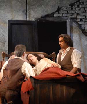 D'emblée, c'est la séduction de quatre artistes, leur pulsion de vie à se créer un monde, leur désinvolture mais aussi leur complicité dans l'adversité. C'est le jeu de la liberté envers et contre toutes les contraintes extérieures. Ce sont tous les attraits de la jeunesse réunis en quelques scènes. Sans trop s'appuyer sur l'indigence du milieu «artiste», – mansarde froide du Quartier Latin, petit matin frileux près de la Barrière d'Enfer – la mise en scène soignée de François Racine sert admirablement la pièce, de la comédie à la tragédie, de tableau en tableau, on se sent littéralement happé par le drame qui se joue. Simplicité mais efficacité. Certes, on pourrait lui reprocher un certain manque d'audace ou d'innovation et une lecture un peu rapide de la pièce. Ce sont des chemins de traverse qui mènent droit au but, une suite ininterrompue de scènes animées avec la touche onirique en relief. Les éclairages de Serge Gingras avec ses lueurs profondes, donnent de la perspective aux décors d'Erhard Rom, comme dans les toiles d'un grand maître. Lumière bleutée traversant la scène à la première rencontre de Mimi et Rodolfo ; Parpignol ouvrant le deuxième tableau du Café Momus ; reflets changeants de clair-obscur – on pense notamment à la voix de Musetta et les stances saccadées des balayeurs – faisant basculer le rêve en cauchemar. Partout les jeux de lumière, la brillance des couleurs chatoyantes, les images subtiles foisonnent et s'imbriquent parfaitement à cette fresque peinte à la brosse. Les costumes plutôt traditionnels sont riches et superbes. Tous ces concepteurs ont réussi le tour de force de se jouer des stéréotypes naturalistes, de créer un monde tantôt tangible et bien réel, tantôt sensible et imaginaire. C'est l'écrin fascinant d'un microcosme, d'un monde vivant en marge de la société, dans lequel se meuvent en toute liberté les personnages de la pièce. Les jeunes artistes acquièrent au fil des tableaux une densité, une profondeur tragique. Mais tout est centré autour des deux couples. Musetta, l'amie du peintre Marcello et surtout la frêle Mimi qui revient mourir dans les bras amoureux de Rodolfo.