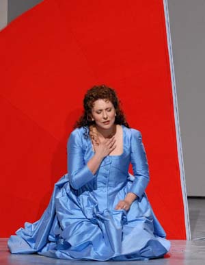 Un mur blanc en hémicycle percé de niches d'où entrent et sortent les protagonistes, c'est le décor à subir pendant presque tout le spectacle. Par moments, des parois coulissantes s'avancent pour former des espaces plus ou moins restreints dans lesquels on imagine que les sentiments ou les fantasmes des personnages sont emprisonnés. Censeur et voyeur de l'intrigue qu'il met en place, Don Alfonso ordonne l'action. C'est un peu court et certainement pas suffisant pour étayer le récit. Mais pour Jean Jourdheuil, qu'importe l'histoire à raconter dès l'instant qu'il peut faire admirer le panopticon (le mot est-il allusif ?) du décorateur Mark Lammert sous toutes ses coutures ? Ainsi la direction d'acteurs se limite-t-elle à des entrées et des sorties, des croisements de personnages, des passages de témoins, des avancées, des reculades. Délaissant la caractérisation des personnages, Guglielmo, Ferrando, Fiordiligi et Dorabella ne sont que des marionnettes imbéciles. Les amants ne sont jamais ni dans la farce, ni dans l'humour, projetés dans une banalité déconcertante. Quant aux deux sœurs, elles s'ignorent plus souvent qu'elles ne sont complices. De leur côté, les membres du chœur vêtus de redingotes noires et de gants blancs doivent se réclamer d'un Monsieur Purgon ou autres Diafoirus de comédie. Qui sait ? Dans leurs déambulations de croque-morts, ils en ont l'allure sans le comique. Sans avoir les yeux constamment rivés sur les surtitres, bien malin le spectateur qui, pas très au courant de l'intrigue de Da Ponte, réussit à saisir les enjeux de cette comédie intellectualisée à outrance.