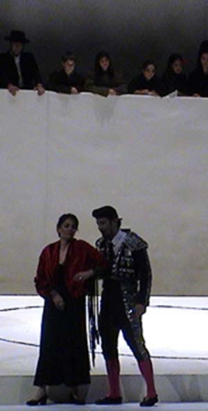 Les quatre actes se déroulent donc entre les trois murs d'une place blanche andalouse aussi gaie qu'une caserne de la Guardia Civil. Mais que cet espace carré contienne un plateau incliné encadré de quatre réverbères, tel un ring où boxeraient les protagonistes principaux, c'est un procédé qui a déjà beaucoup servi ! A trop vouloir « dire » le concept, on finit par appauvrir le spectacle tel que le public est en droit de le désirer à l'opéra, qui passe pour être un spectacle total.
