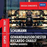 Robert Schumann (1810-1856) : Genoveva, ouverture, Op. 81 ; Concerto pour piano et orchestre, Op. 54 : symphonie n°4, Op. 120 (instrumentation de Gustav Mahler). Martha Argerich, piano ; Gewandhausorchester Leipzig, direction : Riccardo Chailly. Enregistré en septembre 2006.