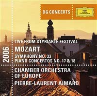 Wolfgang Amadeus Mozart (1756-1791) : Concertos pour piano n°17 KV 453 et n°18 KV 456 ; Symphonie n°33, KV 319. Chamber Orchestra of Europe, direction et piano : Pierre-Laurent Aimard. Enregistré en juillet 2006 au festival Styriate de Graz.
