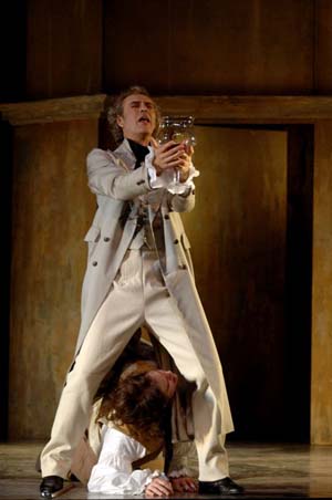 C'est un spectacle classique, qui ne cherche pas à réinventer le mythe, mais c'est un spectacle vivant, dans lequel les acteurs sont bien dirigés, et ont une véritable épaisseur théâtrale. L'action se déroule dans un décor unique, aux murs percés de portes et de fenêtres, qui évoque tantôt une place, la façade d'une demeure, ou un hall d'entrée. Ce beau décor, aux nombreuses portes et cachettes, est aéré, et donne beaucoup de possibilités de mouvements et de variété dans le jeu de scène. Parmi les scènes marquantes : le « viol » de Donna Anna (c'est en fait elle qui poursuit son agresseur, et finit par le chevaucher), la mort poignante du commandeur, pour lequel Don Giovanni semble éprouver beaucoup de compassion, couvrant le mourant de son corps comme pour le réchauffer. La fête dans le château est une vraie débauche (la mise en scène, sans être vulgaire, appelle un chat un chat), que viennent à peine interrompre les trois masques, et se clôt par une vision très spectaculaire : Don Giovanni presque écartelé, qui se libère de ses liens par un effort surhumain, et fait reculer ses agresseurs en faisant tournoyer les cordes comme des fouets. On notera encore la manière fluide et naturelle dont Constant règle les travestissements du début de l'acte II, et un grand sextuor lisible et efficace. Et on ne peut passer sous silence la scène finale, qui est sûrement la plus marquante de toutes : le Commandeur n'apparaît pas, c'est un esprit frappeur qui fait s'envoler les chaises, et il est chanté depuis la fosse d'orchestre, en vraie voix d'outre-tombe. Ce dispositif simple est bien plus percutant qu'une statue qui bouge ou qu'un autre procédé plus sophistiqué ! Le renvoi de Don Giovanni vers les enfers fait lui aussi beaucoup d'effet : il se tord de douleur et d'effroi, se dirige vers le rideau, qui le happe et le hisse, pantelant, vers les cintres. Naturelle, efficace et esthétique, cette production est la preuve qu'on peut faire un spectacle classique et respectueux de l'œuvre sans être poussiéreux, ni ressasser ce qui a déjà été vu cent fois.