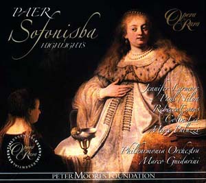 Cette Sofonisba montre en tout cas que ce rival malheureux de Rossini avait quelques sérieux arguments à faire valoir. On s'amusera d'ailleurs à relever quelques échos rossiniens ici ou là, dans une écriture très belcantiste. Les mélodies coulent avec une aisance remarquable, l'intérêt dramatique est toujours soutenu, et la qualité d'orchestration rare dans l'opéra italien de l'époque. On appréciera, par exemple, le rôle très important dévolu aux bois, quasi mozartiens, et la très belle écriture des chœurs. Le premier air de Massinissa est d'ailleurs d'une grande beauté, en rien inférieur à ceux de Bellini ou Donizetti et digne de figurer dans tous les récitals de soprano.