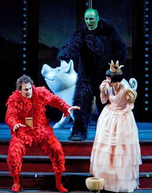 De son côté, le metteur en scène Oskaras Korsunovas fait de son mieux pour combiner cette histoire abracadabrante à la sublime œuvre de Mozart, toutefois sans jamais parvenir à centrer les personnages étrangers à l'intrigue avec ceux du récit initiatique de l'opéra. Alors, on invente, on recrée. Pas toujours avec le meilleur goût scénique. Comme les trois dames vêtues en « bunny girls » noires de Playboy jouant de la gambette devant les habitants du village réunis autour d'un carrousel où se prépare la fête dont l'opéra sera l'apothéose. Comme cette réunion entre Sarastro et les grands prêtres. Avec leurs imposantes barbes, leurs immenses chapeaux pointus comme les sièges cathédraux des dignitaires de l'Eglise, ils ne réussissent qu'à ressembler à une triste équipe de nains de jardin.
