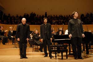 La deuxième partie était structurée comme une surenchère : trois concertos au nombre des solistes toujours croissant. Premier pianiste soliste, Christopher Tainton partait d'une distance certaine avec la partition, redoutable d'intelligence : alerte en articulations, une précision perspectiviste offrait sûrement plus qu'on ne pouvait s'attendre. Aussi, le son plein de l'orchestre, dans le deuxième mouvement, portait le piano vers des pleurnicheries en faux rustique, lui permettait de jouer de belles retenues au dramatisme fastoche. Au bout du compte, la volupté du jeu de Tainton préférait faire la pige aux grands traits du développement que d'assurer une onctuosité du toucher toujours vite un peu ronde. Dans le Concerto pour deux pianos et orchestre (n°10), les deux pianistes (Christoph Eschenbach s'étant mis au piano), suivaient le trait au plus près, jusqu'à le faire pratiquement expérimental : leur unité et leur équilibre étaient sidérant de précision, tant la précision est si rarement capable de largeur, d'ampleur, si ce n'est de démesure.