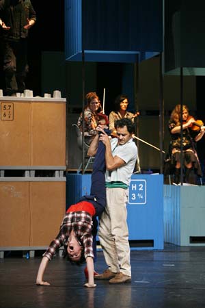 Juché sur une palette, un alto remarquable, Steve Dugardin, chante des extraits d'opéras baroques. Et pourtant, le choix de ce répertoire ne s'impose pas dans « Import/export » comme une évidence. A leur entrée sur le plateau, les danseurs martèlent le sol, imitant le mode de déplacement des culs de jatte, uniquement sur les mains !